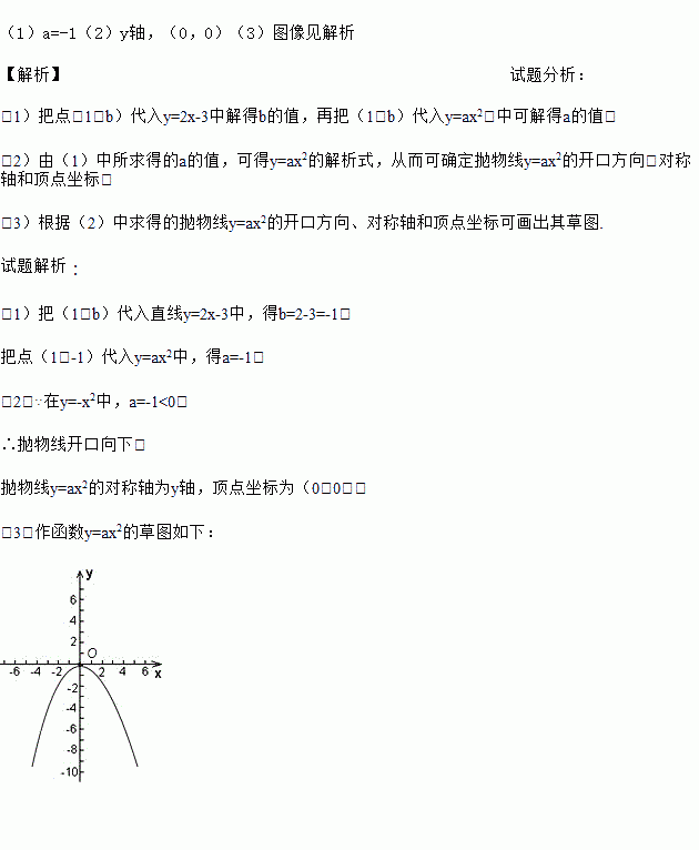 (1)a=-1(2)y轴,(0,0)(3)图像见解析 【解析】试题分析: (1)把点(1,b)代入y=2x-3中解得b的值,再把(1,b)代入y=ax2,中可解得a的值; (2)由(1)中所求得的a的值,可得y=ax2的解析式,从而可确定抛物线y=ax2的开口方向,对称轴和顶点坐标; (3)根据(2)中求得的抛物线y=ax2的开口方向、对称轴和顶点坐标可画出其草图. ...