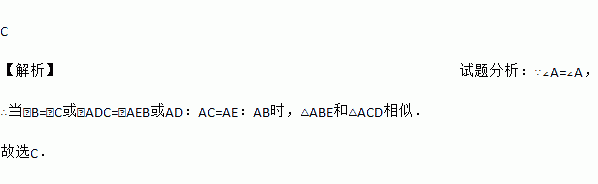 C 【解析】试题分析:∵∠A=∠A, ∴当∠B=∠C或∠ADC=∠AEB或AD:AC=AE:AB时,△ABE和△ACD相似. 故选C.