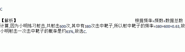 小明练习射击,共射击600次,其中有380次击中靶子,由此可估计,小明射击一次击中靶子的概率是( )