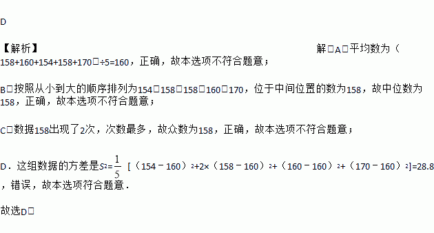 在2016年泉州市初中体育中考中,随意抽取某校5位同学一分钟跳绳的次数分别为:158,160,154,158,170,则由这组数据得到的结论错误的是( )