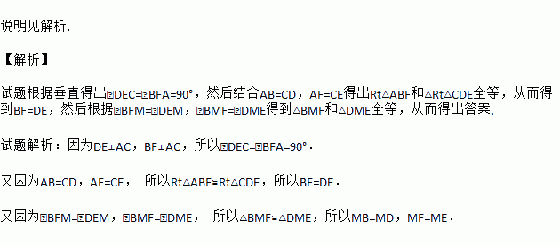 如图,E、F分别为线段AC上两个动点,且DE⊥AC于E,BF⊥AC于F,若AB=CD,AF=CE,BD交AC于M.说明:MB=MD,ME=MF.
