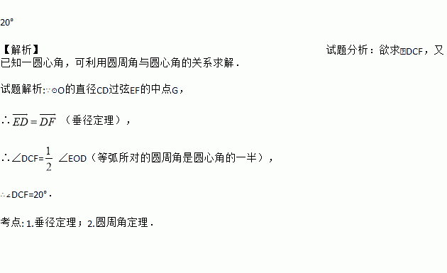 如图,⊙O的直径CD过弦EF的中点G,∠EOD=40°,则∠DCF=________.
