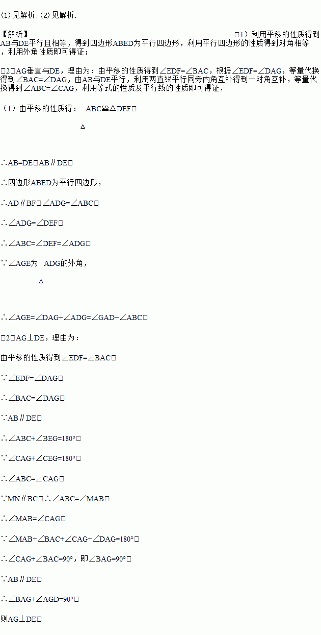 如图所示,将沿直线BC方向平移的位置,G是DE上一点,连接AG,过点A、D作直线MN.
