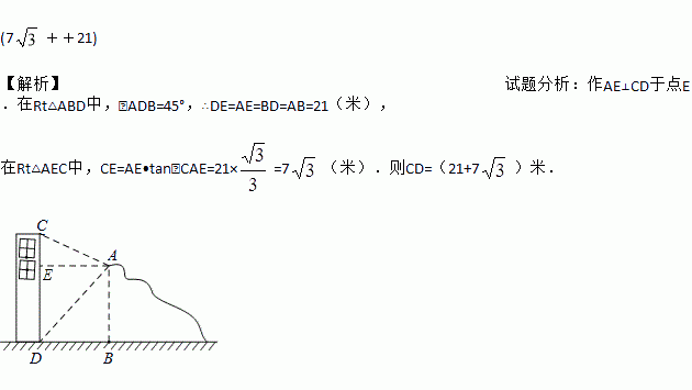 如图,在高度是21米的小山A处测得建筑物CD顶部C处的仰角为30°,底部D处的俯角为45°,则这个建筑物的高度CD=_________米(结果保留根号).
