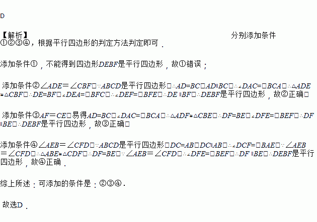 如图,点 E,F 是?ABCD 对角线上两点,在条件①DE=BF;②∠ADE=∠CBF; ③AF=CE;④∠AEB=∠CFD 中,添加一个条件,使四边形 DEBF 是平行四边形,可添加 的条件是( )