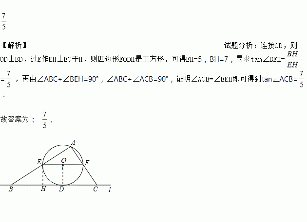 如图,直线l与⊙相切于点D,过圆心O作EF∥l交⊙O于E、F两点,点A是⊙O上一点,连接AE,AF,并分别延长交直线于B、C两点;若⊙的半径R=5,BD=12,则∠ACB的正切值为 ______ .