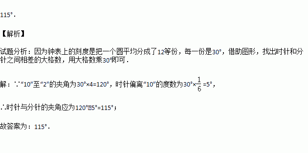在时刻10:10时,时钟上的时针与分针间的夹角是 .