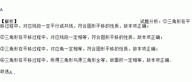 A 【解析】试题分析:①三角形在平移过程中,对应线段一定平行或共线,符合图形平移的性质,故本项正确; ②三角形在平移过程中,对应线段一定相等,符合图形平移的性质,故本项正确; ③三角形在平移过程中,对应角一定相等,符合图形平移的性质,故本项正确; ④三角形在平移过程中,所得三角形与原三角形全等,故面积一定相等,故本项正确. 故选A.