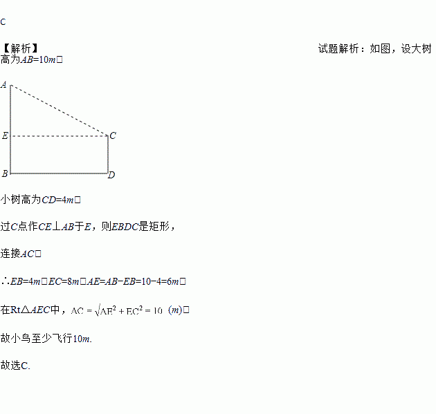 如图,有两棵树,一棵高10米,另一棵高4米,两树相距8米,一只小鸟从一棵树的树稍飞到另一棵树的树稍,问小鸟至少要飞行( )