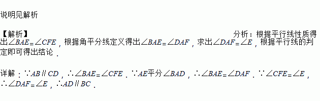 如图,AB∥CD,AE平分∠BAD,CD与AE相交于F,∠CFE=∠E.试说明:AD∥BC.