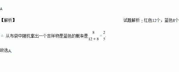校运动会上,一个不透明的布袋里装有20个除颜色不同外其它都相同的吉祥物,其中红色12个,蓝色8个,则颁奖嘉宾从布袋中随机拿出一个吉祥物是蓝色的概率是( ).