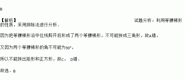 B ¡¾½âÎö¡¿ÊÔÌâ·ÖÎö£ºÀûÓõÈÑüÌÝÐεÄÐÔÖÊ£¬²ÉÓÃÅųý·¨½øÐзÖÎö£® ÒòΪ°ÑµÈÑüÌÝÐÎÑØÖÐλÏß¼ô¿ªºóÐγÉÁËÁ½¸öµÈÑüÌÝÐΣ¬²»¿ÉÄÜÆ´³ÉÈý½ÇÐΣ¬¹ÊA´í£¬ ÓÖÒòΪÁ½¸öµÈÑüÌÝÐεĽDz»¿ÉÄÜΪ90¡ã£¬ ËùÒÔ²»ÄÜÆ´³ö¾ØÐκÍÕý·½ÐΣ¬¹ÊC£¬ D´í£® ¹ÊÑ¡£®B