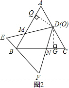 2.我们做如下的规定:如果一个三角形在运动变化时保持形状和大小不变,则把这样的三角形称为三角形板.把两块边长为4的等边三角形板ABC和DEF叠放在一起,使三角形板DEF的顶点D与三角形板ABC的AC边中点O重合,把三角形板ABC固定不动,让三角形板DEF绕点O旋转,设射线DE与射线AB相交于点M,射线DF与线段BC相交于点N.(1)如图1,当射线DF经过点B,即点Q与点B重合时,易证△ADM∽△CND.此时,AM•CN=4.