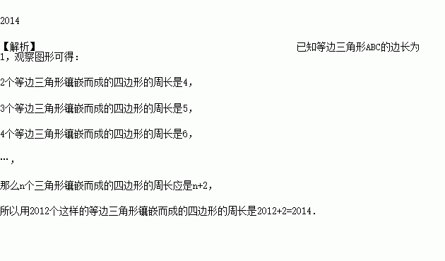 如图所示,已知等边三角形ABC的边长为,按图中所示的规律,用2012个这样的三角形镶嵌而成的四边形的周长是 .