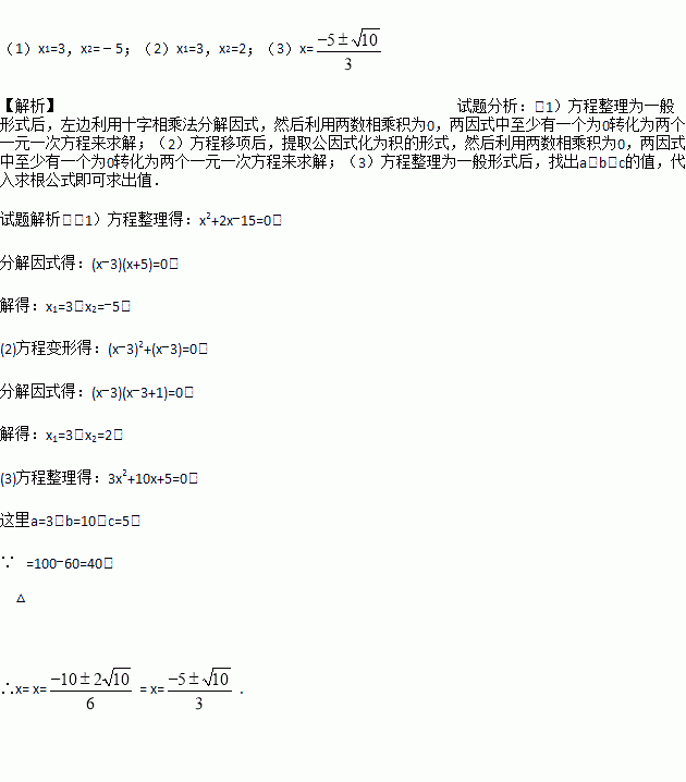 解方程:(1)(x﹣1)(x+3)=12;(2)(x﹣3)2=3﹣x;(3)3x2+5(2x+1)=0.