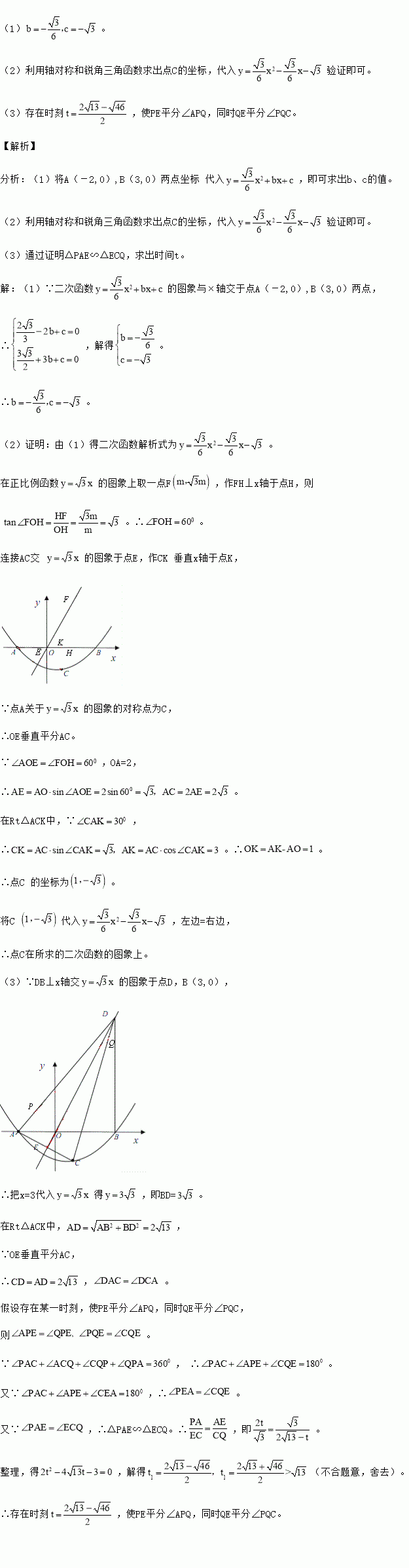 的图象于点E,连结AD、CD。如果动点P从点A沿线段AD方向以每秒2个单位的速度向点D运动,同时动点Q从点D沿线段DC方向以每秒1个单位的速度向点C运动,当其中一个到达终点时,另一个随之停止运动,连结PQ、QE、PE,设运动时间为t秒,是否存在某一时刻,使PE平分∠APQ,同时QE平分∠PQC,若存在,求出t的值;若不存在,请说明理由。