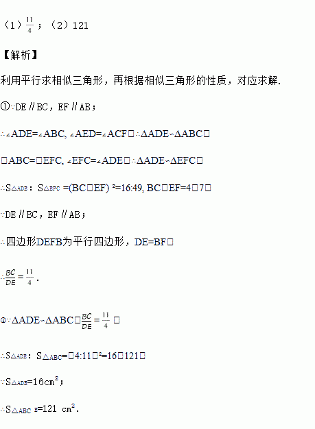 如图,在△ABC中,DE∥BC,EF∥AB,若S△ADE=16cm2,S△EFC=49cm2, 求①,②S△ABC.