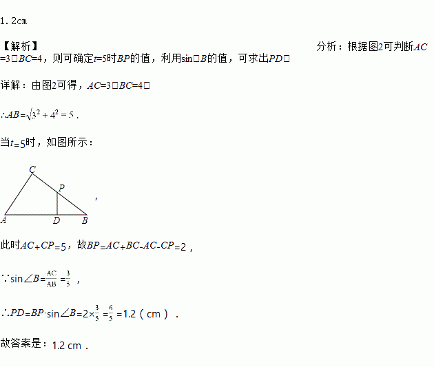 如图1,在Rt△ABC中,∠ACB=900,点P以每秒1cm的速度从点A出发,沿折线AC-CB运动,到点B停止,过点P作PD⊥AB,垂足为D,PD的长y(cm)与点P的运动时间x(秒)的函数图象如图2所示,当点P运动5秒时,PD的长是____________.