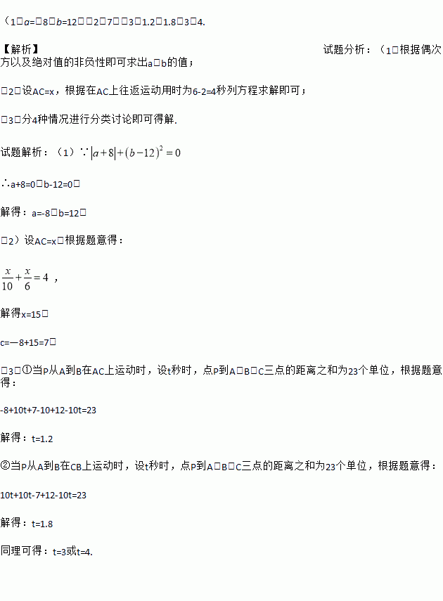 (2)动点P从A点出发,以每秒10个单位的速度沿数轴向右运动,到达B点停留片刻后立即以每秒6个单位的速度沿数轴返回到A点,共用了6秒;其中从C到B,返回时从B到C(包括在B点停留的时间)共用了2秒.