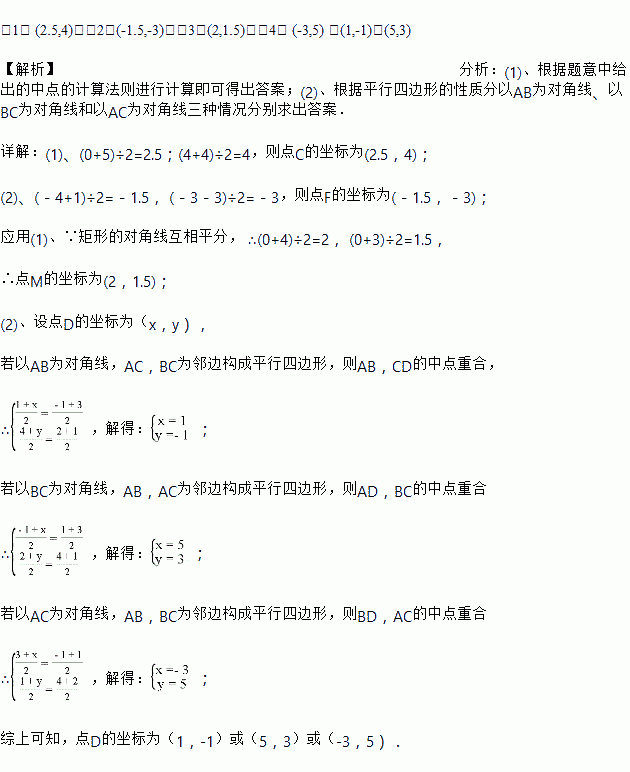 (1)如图(1),C为线段AB中点,A点坐标为(0,4),B点坐标为(5,4),则点C的坐标为