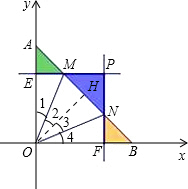 (2)将x的值代入题(1)所得的函数关系式中,即可得到y的值,也就确定了P点的坐标;过O作OH⊥AB于H,在等腰Rt△OAB中,通过解直角三角形,可求得AB、OH的长,此时发现OH=OE,则可证得Rt△EMO≌Rt△HMO,由此可得∠1=∠2,同理可证得∠3=∠4,由于∠EOF=90°,则∠2+∠3=∠MON=45°,由此得解.
