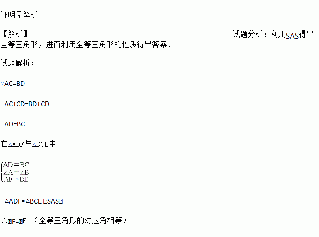 如图,已知AF=BE,∠A=∠B,AC=BD.求证:∠F=∠E.