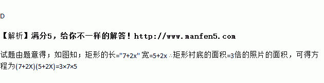 某学校组织艺术摄影展,上交的作品要求如下:七寸照片(长7英寸,宽5英寸);将照片贴在一张矩形衬纸的正中央,照片四周外露衬纸的宽度相同;矩形衬纸的面积为照片面积的3倍.设照片四周外露衬纸的宽度为x英寸(如图),下面所列方程正确的是( )