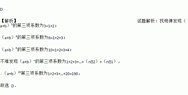 根据“杨辉三角”请计算(a+b)20的展开式中第三项的系数为( )
