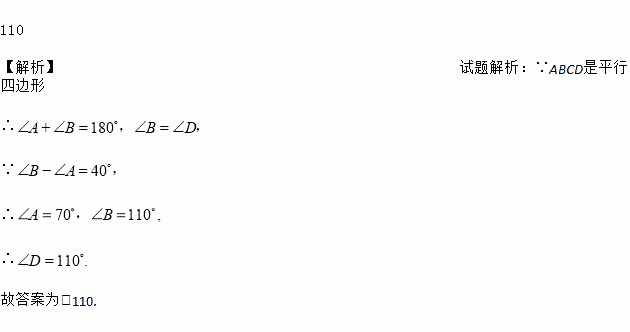 平行四边形ABCD中,∠B-∠A=40°,则∠D=________°.