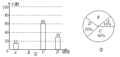 为推广阳光体育“大课间”活动,我市某中学决定在学生中开设A:实心球,B:立定跳远,C:跳绳,D:跑步四种活动项目.为了了解学生对四种项目的喜欢情况,随机抽取了部分学生进行调查,并将调查结果绘制成如图①②的统计图.请结合图中的信息解答下列问题: