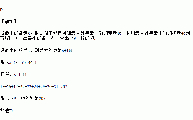 如图是某月的日历表,在此日历表上可以用一个矩形圈出 3×3 个位置的9 个数(如 6、7、8、13、14、15、20、21、22).若圈出的 9 个数中,最大 数与最小数的和为 46,则这 9 个数的和为( )