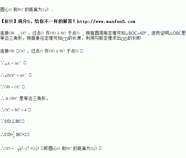 已知:如图,的外接圆,弦的长为,,求圆心到的距离.