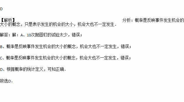 A. 小明在10次抛图钉的试验中发现3次钉尖朝上,由此他说钉尖朝上的概率是30%