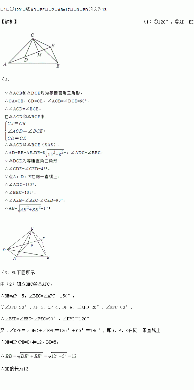 如图2,△ACB和△DCE均为等腰三角形,且∠ACB=∠DCE=90°,点A、D、E在同一直线上,若AE=15,DE=7,求AB的长度.