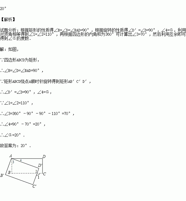 如图,将矩形ABCD绕点A顺时针旋转到矩形AB′C′D′的位置,旋转角为α(0°<α<90°),若∠1=110°,则∠α= .
