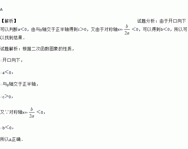 A 【解析】试题分析:由于开口向下可以判断a<0,由与y轴交于正半轴得到c>0,又由于对称轴x=-<0,可以得到b<0,所以可以找到结果. 试题解析:根据二次函数图象的性质, ∵开口向下, ∴a<0, ∵与y轴交于正半轴, ∴c>0, 又∵对称轴x=-<0, ∴b<0, 所以A正确.