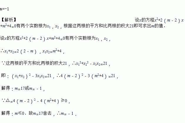 已知关于的方程两根的平方和比两根的积大21,求的值