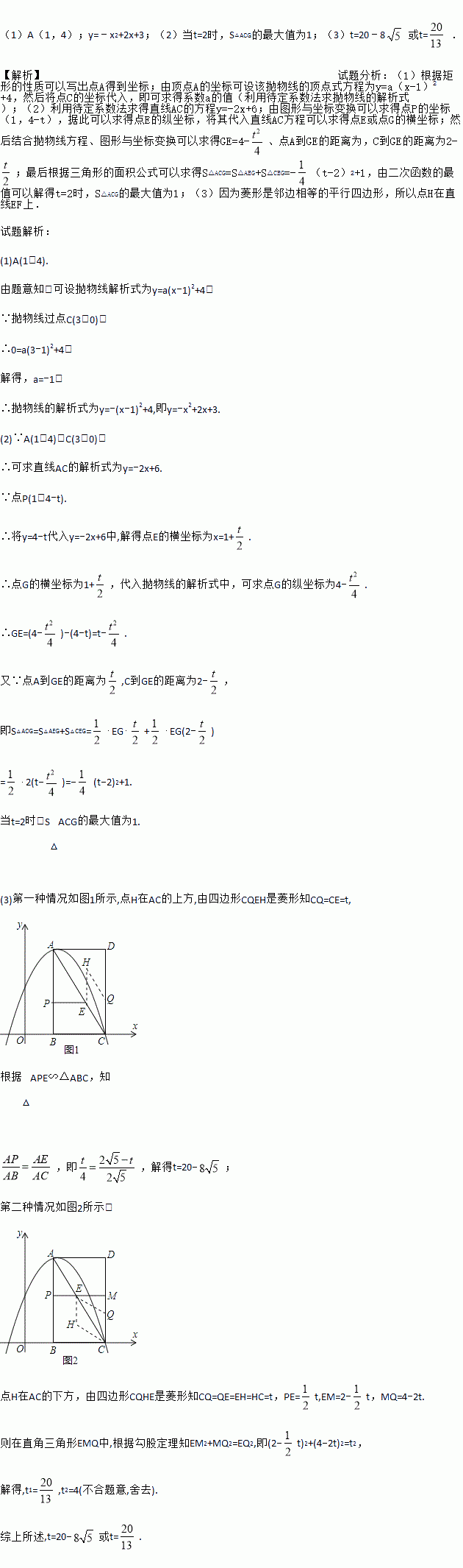 (1)A(1,4);y=﹣x2+2x+3;(2)当t=2时,S△ACG的最大值为1;(3)t=20﹣8 或t= . 【解析】试题分析:(1)根据矩形的性质可以写出点A得到坐标;由顶点A的坐标可设该抛物线的顶点式方程为y=a(x-1)2+4,然后将点C的坐标代入,即可求得系数a的值(利用待定系数法求抛物线的解析式);(2)利用待定系数法求得直线AC的方程y=-2x+6;由图形与坐标变换可以求得...