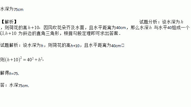 古诗赞美荷花“竹色溪下绿,荷花镜里香”,平静的湖面上,一朵荷花亭亭玉立,露出水面10 cm,忽见 它随风斜倚,花朵恰好浸入水面,仔细观察,发现荷花偏离原地40 cm(如图).请部:水深多少?