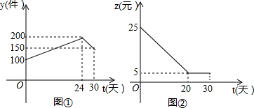 12.如图是本地区一种产品30天的销售图象,图①是产品日销售量y(单位:件)与时间t(单位;天)的函数关系,图②是一件产品的销售利润z(单位:元)与时间t(单位:天)的函数关系,已知日销售利润=日销售量×一件产品的销售利润,下列结论错误的是( )