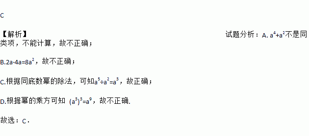 C 【解析】试题分析:A. a4+a2不是同类项,不能计算,故不正确; B.2a·4a=8a2,故不正确; C.根据同底数幂的除法,可知a5÷a2=a3,故正确; D.根据幂的乘方可知 (a3)3=a9,故不正确. 故选:C.