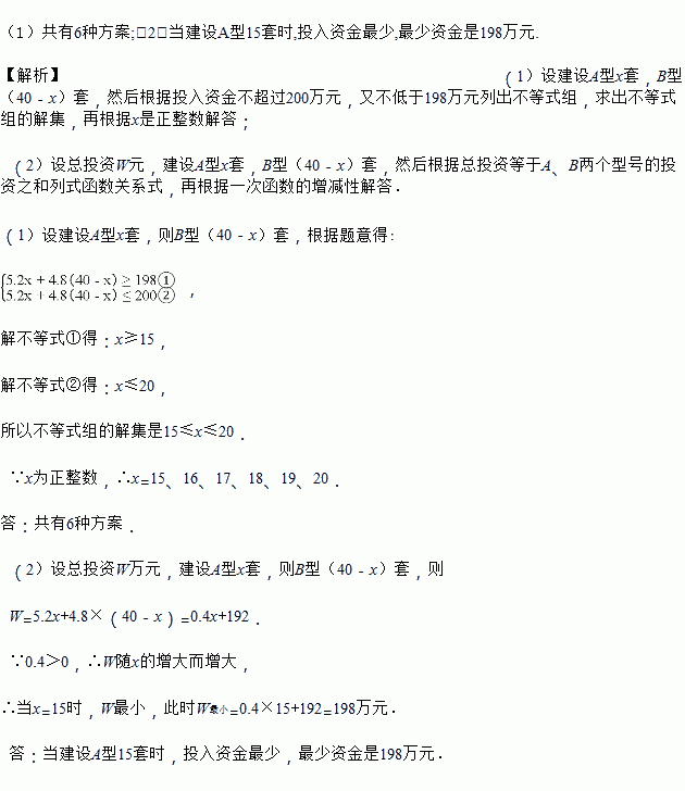 为了落实党中央提出的“惠民政策”,我市今年计划开发建设A、B两种户型的“廉租房”共40套.投入资金不超过200万元,又不低于198万元.开发建设办公室预算:一套A型“廉租房”的造价为5.2万元,一套B型“廉租房”的造价为4.8万元.