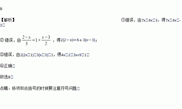 ,得2(2-x)=3+3(x-3);③由2(2x-1)-3(x-3)=1,得4x-2-3x-9=1;④由2(x+1)=7+x,得x=5.其中正确的有( )
