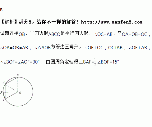 如图,点A、B、C是⊙O上的三点,且四边形ABCO是平行四边形,OF⊥OC交圆O于点F,则∠BAF等于( )