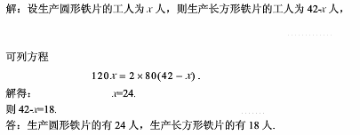 的某车间主要负责生产制造油桶用的的圆形铁片和长方形铁片,该车间有工人42人,每个工人平均每小时可以生产圆形铁片120片或者长方形铁片80片.如图,一个油桶由两个圆形铁片和一个长方形铁片相配套. 生产圆形铁片和长方形铁片的工人各为多少人时,才能使生产的铁片恰好配套?