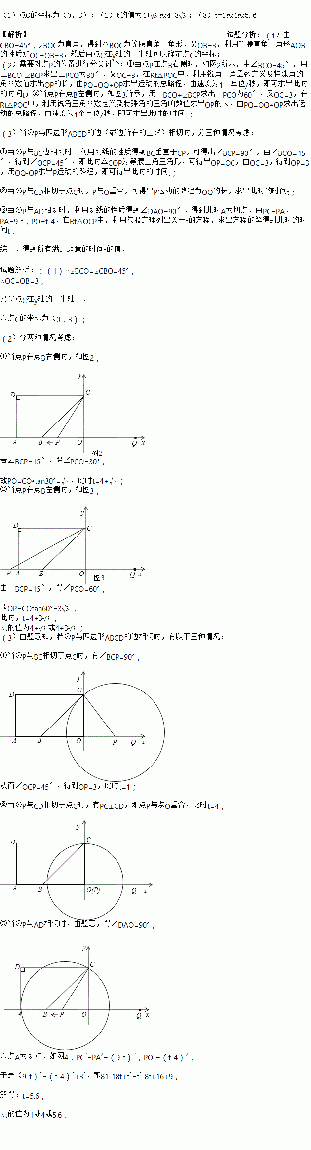 (3)以点P为圆心,PC为半径的⊙P随点P的运动而变化,当⊙P与四边形ABCD的边(或边所在的直线)相切时,求t的值.