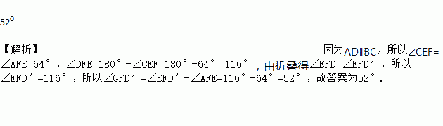 如图,将一张长方形纸片ABCD沿EF折叠,使顶点C,D分别落在点C′、D′处,C′E交AF于点G,若∠CEF=64°,则∠GFD′=_____________.