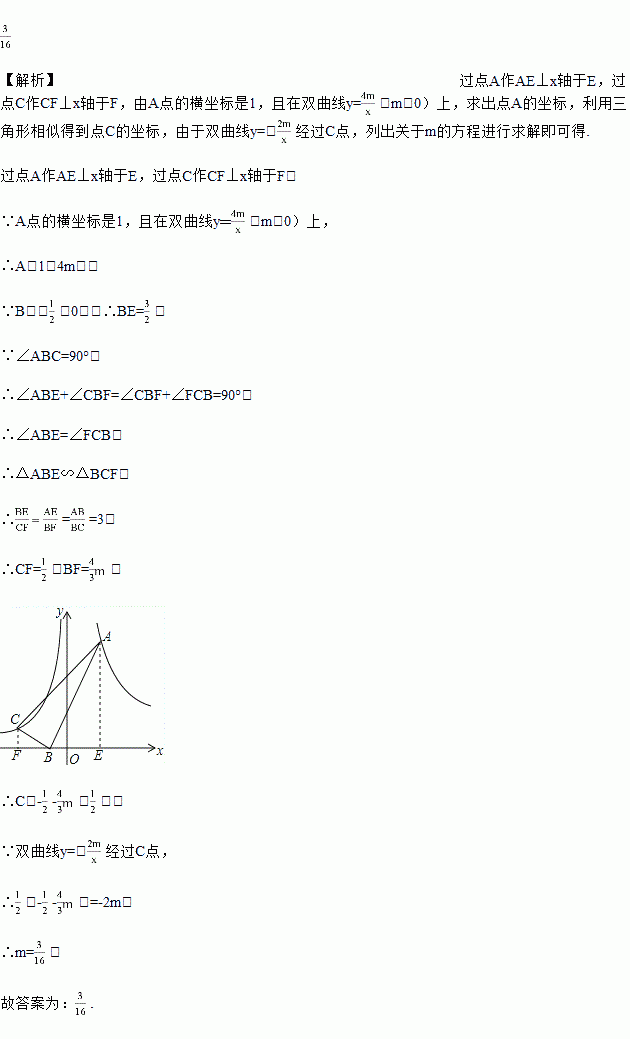 如图,在Rt△ABC中,∠ABC=90°,点B在x轴上,且B(﹣,0),A点的横坐标是1,AB=3BC,双曲线y=(m>0)经过A点,双曲线y=﹣经过C点,则m的值为____.