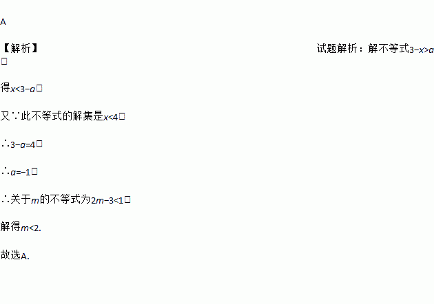 若关于x的不等式3-x>a的解集为x<4,则关于m的不等式2m+3a<1的解为( )