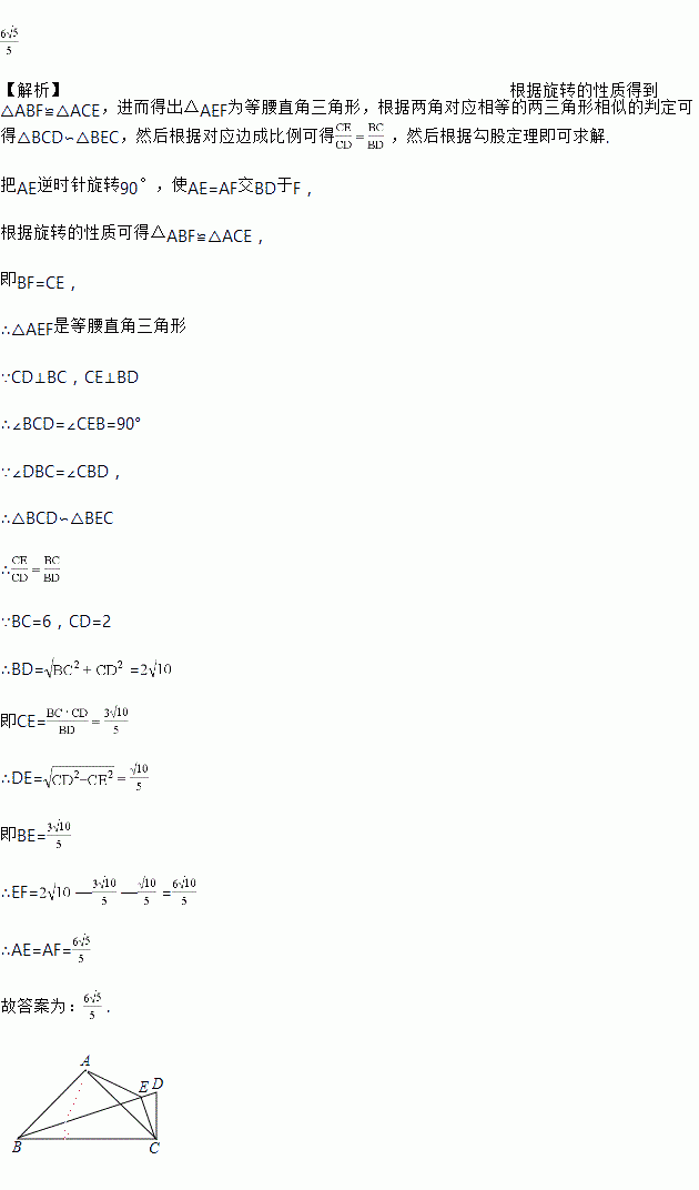 如图,等腰直角△ABC中,∠BAC=90°,BC=6,过点C作CD⊥BC,CD=2,连接BD,过点C作CE⊥BD,垂足为E,连接AE,则AE长为_____.